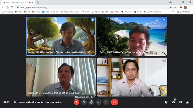 Nhằm kịp thời nắm bắt thông tin về việc tổ chức dạy học theo hình thức không tập trung học sinh đến trường để đánh giá về ưu điểm, hạn chế của công tác tiển khai, rút kinh nghiệm chung cho các đơn vị trên địa bàn Huyện. Bên cạnh đó, cũng nhằm kịp thời tư vấn cho các đơn vị tháo gỡ các khó khăn và động viên đội ngũ nhà giáo và các em học sinh. Phòng GDĐT đã tổ chức thăm, nắm tình hình thực tế với nhiều hình thức như: Trao đổi với lãnh đạo nhà trường; đến nhà thăm giáo viên, học sinh. Đặc biệt là vào phòng học ảo (không thông báo trước) để thăm nắm tình hình dạy học trực tuyến. Trong mỗi lần “ghé thăm” lớp học trực tuyến, ông Lý Bảo Việt, Trưởng phòng GDĐT đều có trao đổi để động viên thầy, cô giáo và các em học sinh, đặc biệt là dặn dò các em học sinh có gắng thích nghi với hình thức học trực tuyến để có kết quả học tập tốt.